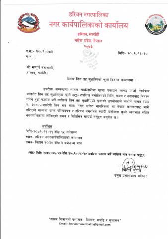 - हरिवन नगरपालिका "आर्थिक सहायता उपलब्ध गराउनेसम्वन्धी कार्यविधि, २०७५"
