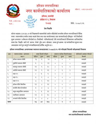 हरिवन नगरपालिका अन्तर्गतका स्वास्थ्य सस्थाहरुबाट २०७७।१।२५ गते गरिएको विरामी परीक्षणको विवरण सम्बन्धि प्रेस विज्ञप्ति ।